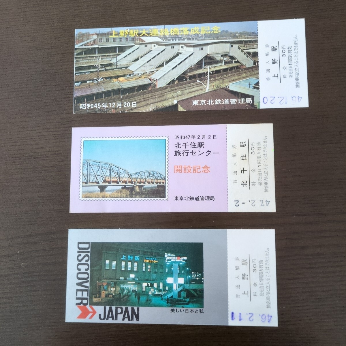 - 国鉄東京北鉄道管理局「上野駅大連絡橋落成記念」入場券(昭和45年)&「北千住駅旅行センター開設記念」入場券(昭和47年)のセット
