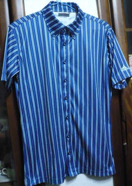 > 美品 adidas【アディダス:テーラーメイド ゴルフ(株)】製ボタンダウンストライプ半袖シャツ S ネイビー JO298 GOLF