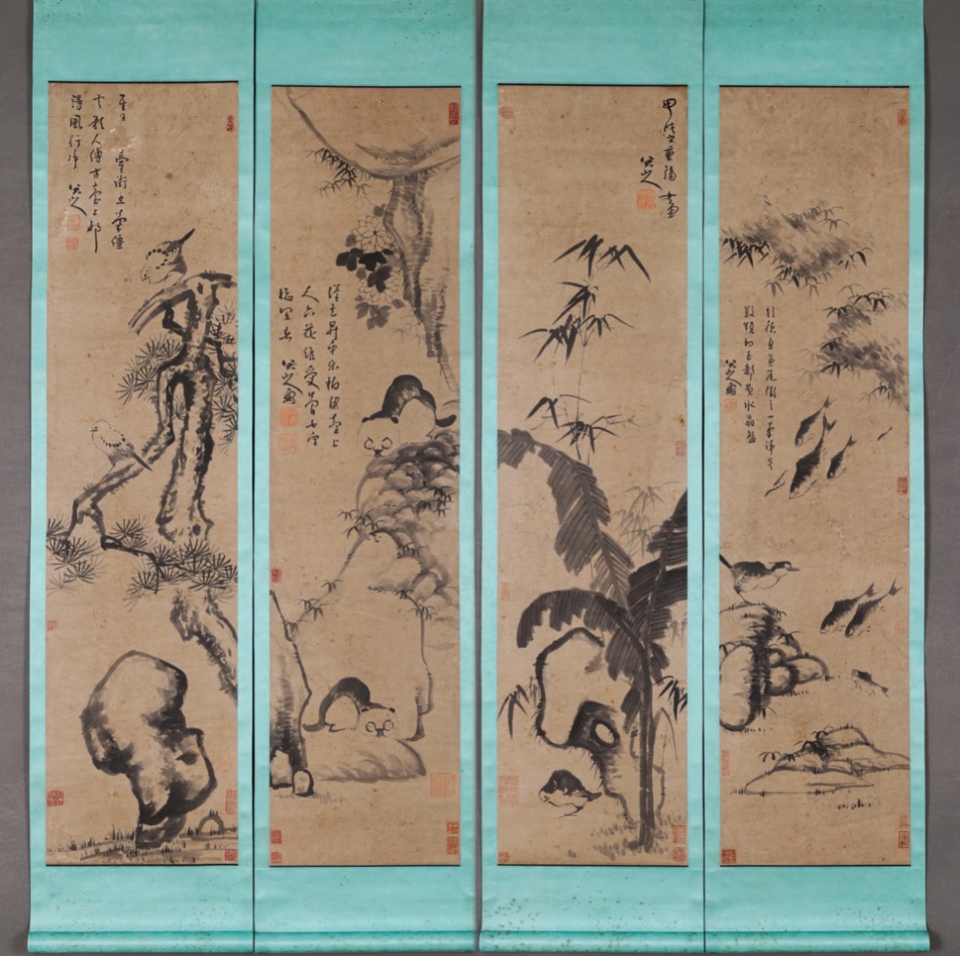 > 古美術 掛け軸 中国・清時代 「八大山人書」 紙本 【魚鳥猫趣図 四条屏】 立軸 書道 巻き物 肉筆保証 唐物 古画 画心135x33cm LT-250631