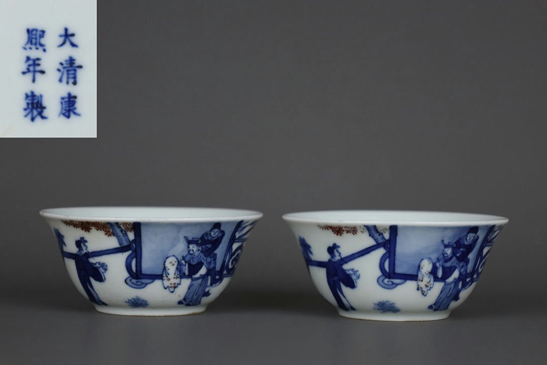 > ■観心・時代旧蔵■C0152清康熙年製 青花釉里紅人物故事図杯一対・時代物・古陶磁・古賞物・旧家買出品