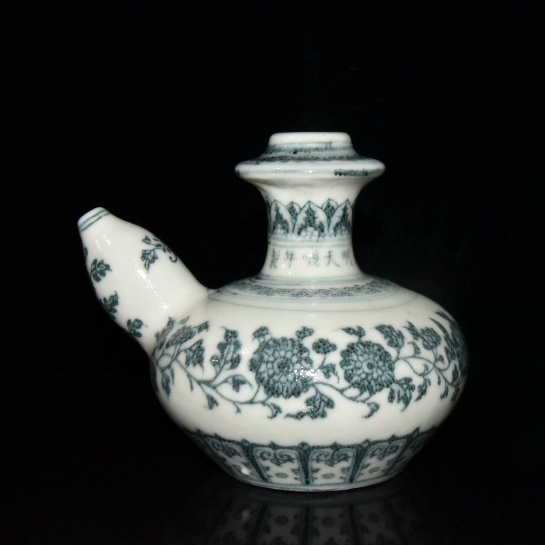 > 【仁】『明・天順年製款・古陶瓷品・青花・花卉紋・酒壺・陶藝』極細工 古董品 中国古玩 古美術 古美味 時代物 旧家蔵出