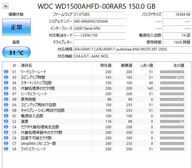 > 速達 希少 SATA HDD 3.5インチ 透明窓付 Western Digital WDC Raptor X WD1500AHFD-00RAR5 150GB 1426時間 正常判定 ★動作保証 H9202