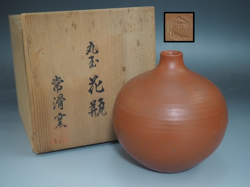 - B1750 常滑窯 桐陶房 朱泥 丸玉花瓶 共箱付 ☆ 花道具 華道具 茶道具 花器 花瓶 花入 花生 花活 一輪挿し 飾壷 飾壺 陶器 在銘 陶印 窯印