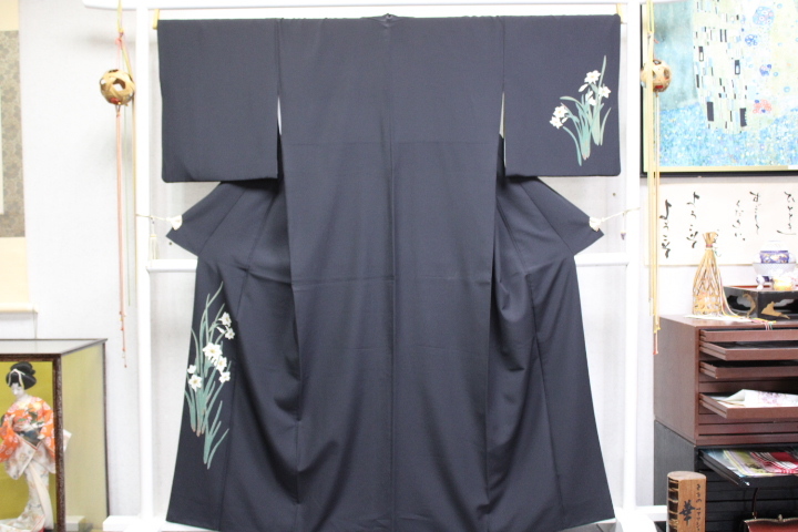- きもの今昔8569 付け下げ訪問着 広衿袷仕立 上質の合繊ポリエステル100% ちりめん地黒に水仙の柄 身丈161cm