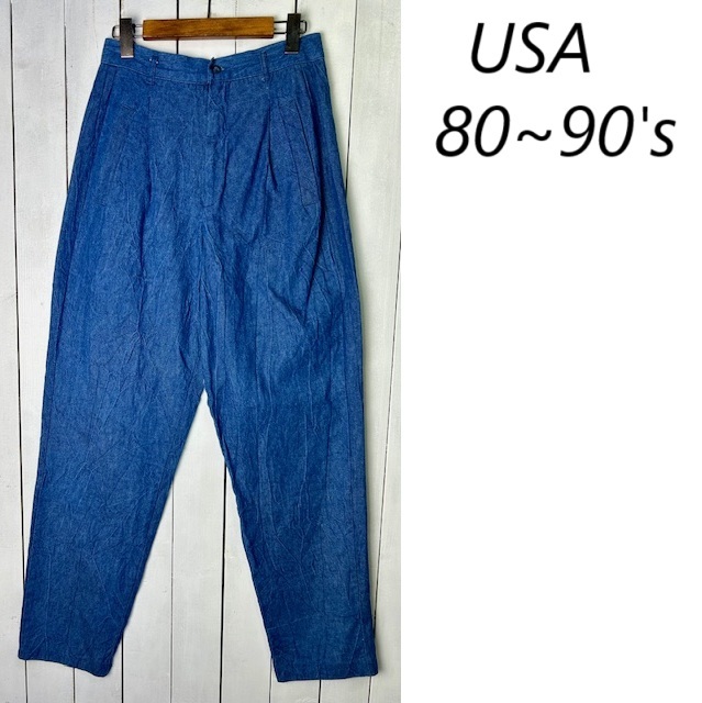 > USA古着 80s~90s USA製 薄手 シワ加工デニムトラウザーズパンツ 8 オールド ヴィンテージ インディゴスラックス ワイドテーパード ●276