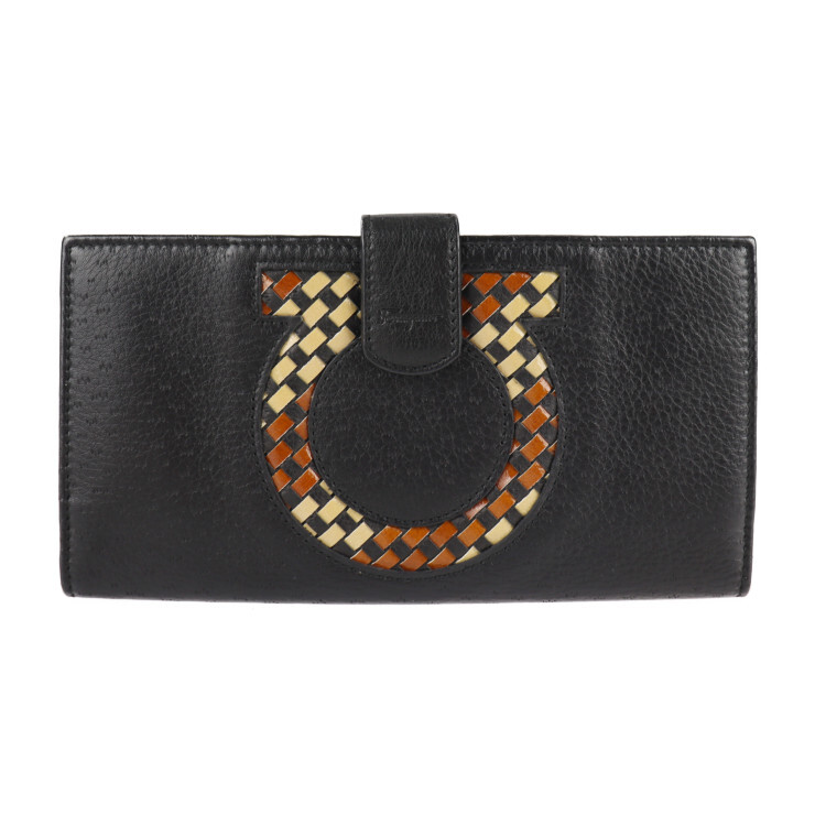 - 美品 サルヴァトーレ フェラガモ ガンチーニ 長財布 22 7221 レザー ブラック 編み込み柄 二つ折り財布【本物保証】