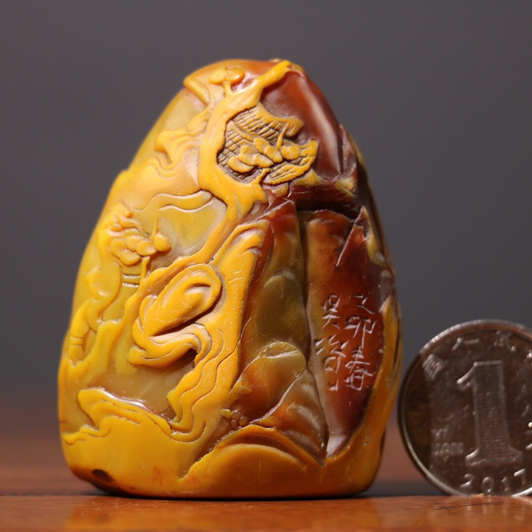 - 蔵友旧蔵出 寿山石 田黄石 細密彫 春山行旅図 印章 箱付 貴重品 稀少物品 置物 賞物 中国時代美術品