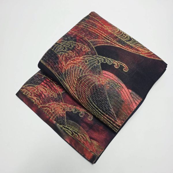- 帯 袋帯 織物 訪問着 着物 波 赤黒金糸 結婚式 祝い事 4m40cm ゴージャス 中古品 M-003