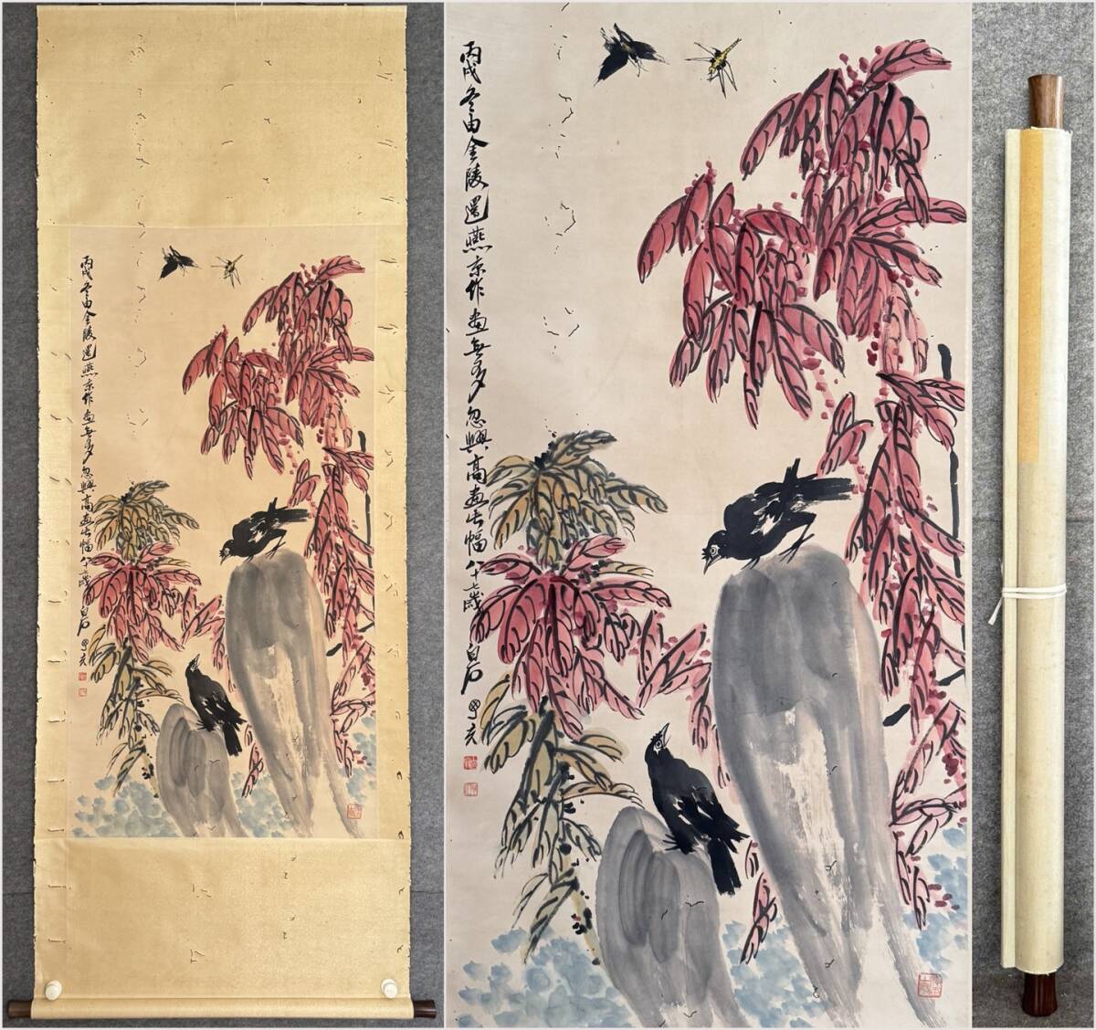 - 古美術 掛け軸 中国・近現代 「斉白石書」 紙本 【花鳥図】 立軸 書道 巻き物 肉筆保証 唐物 古画 画心136.5x68.5cm LT-250665