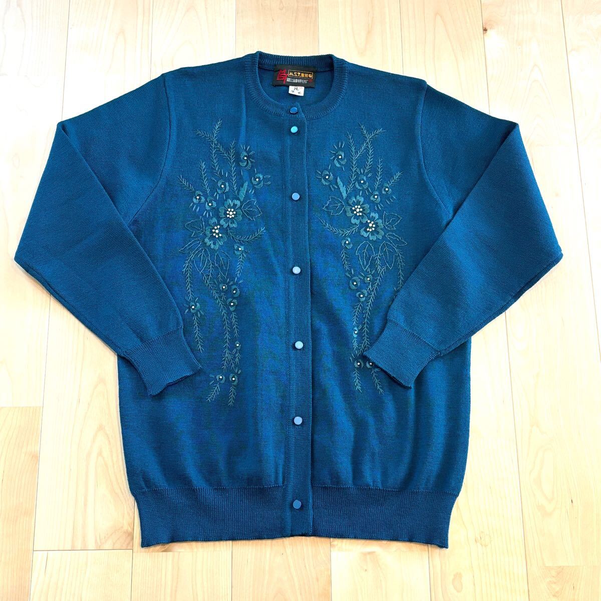 - 新品未使用 丸首ウール長袖カーディガン 花刺しゅう ブルーグリーン レトロ 通勤 クルーネックカーディガン ラピスブルー 青
