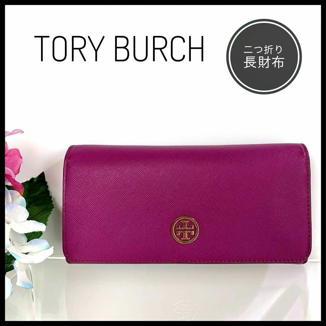 - トリーバーチ 二つ折り長財布 フラップ スナップボタン開閉 レザー パープル