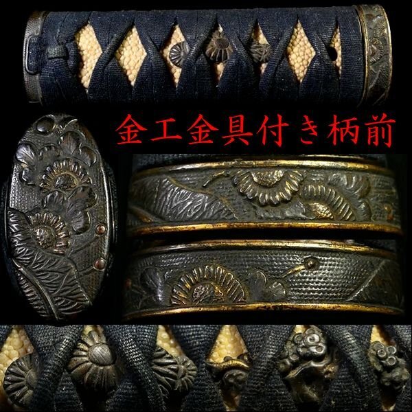 > 【 恵 #1694 】 花細工金工金具付 柄前 縁頭:菊花図 金色絵 赤銅魚々子地 目貫:菊梅図 赤銅地 検:刀剣/刀装具