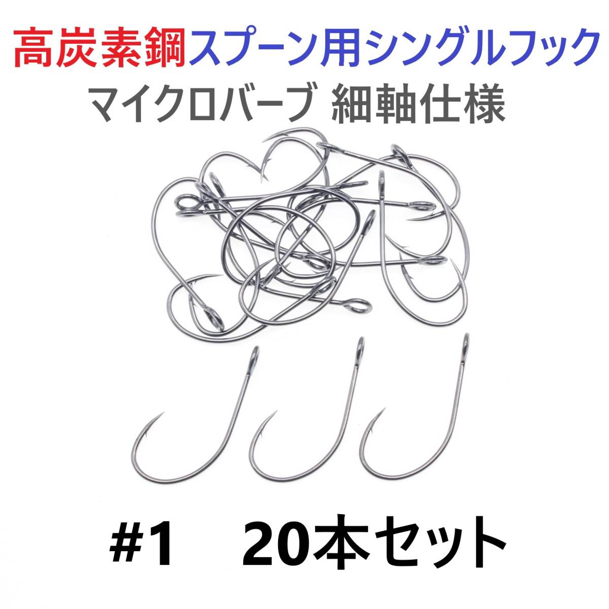 - 【送料無料】高炭素鋼 スプーン用 シングルフック #1 20本セット マイクロバーブ 細軸仕様 横アイ ビッグアイ トラウト 渓流 管釣り