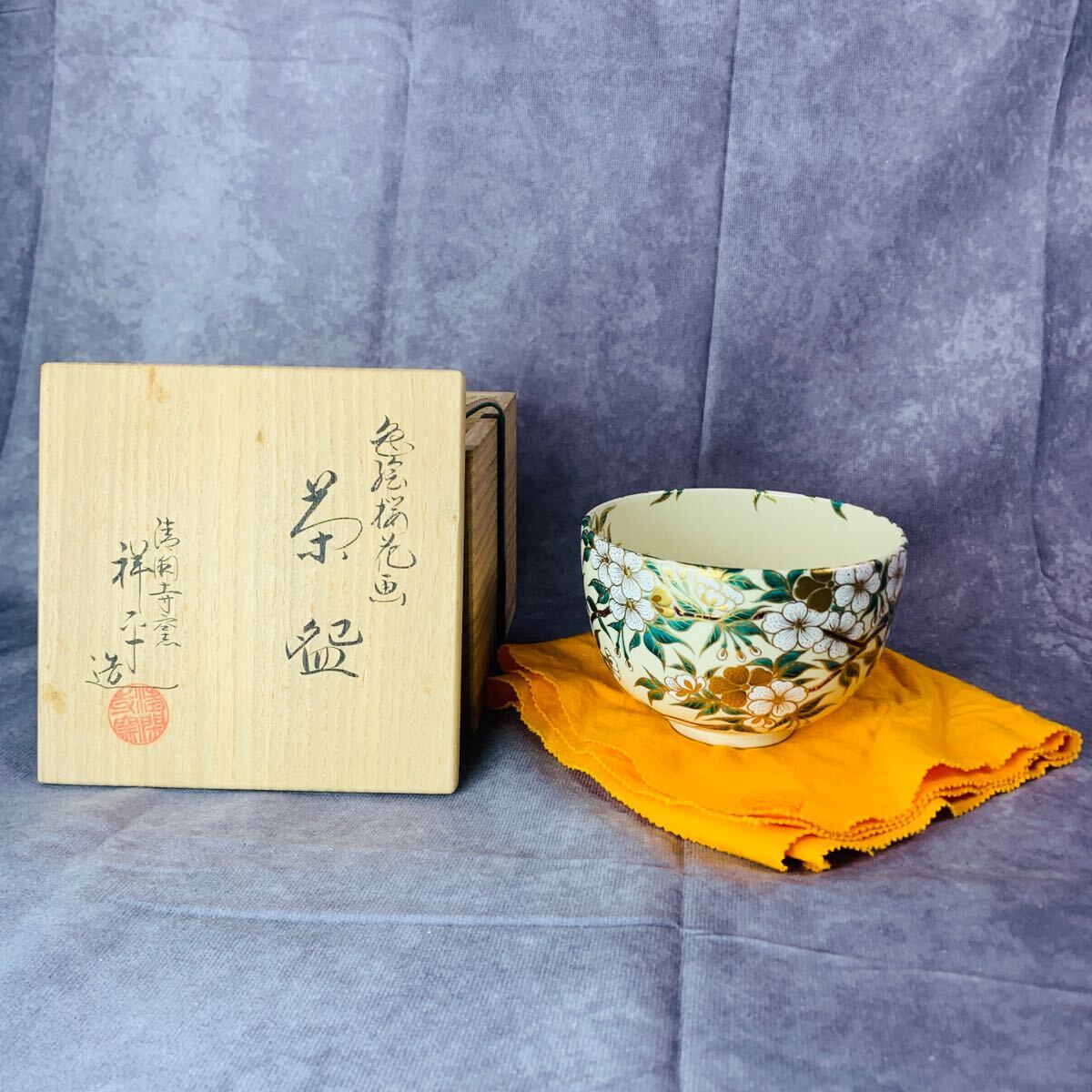 - 京焼 茶碗 清閑寺窯 杉田祥平 造 金彩 色絵桜花画 共布・共箱 茶道具 抹茶碗