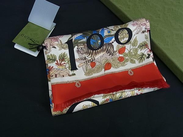 - ■新品■未使用■ GUCCI グッチ シルク100% フリンジ ストール ショール スカーフ レディース アイボリー系×マルチカラー FD2442