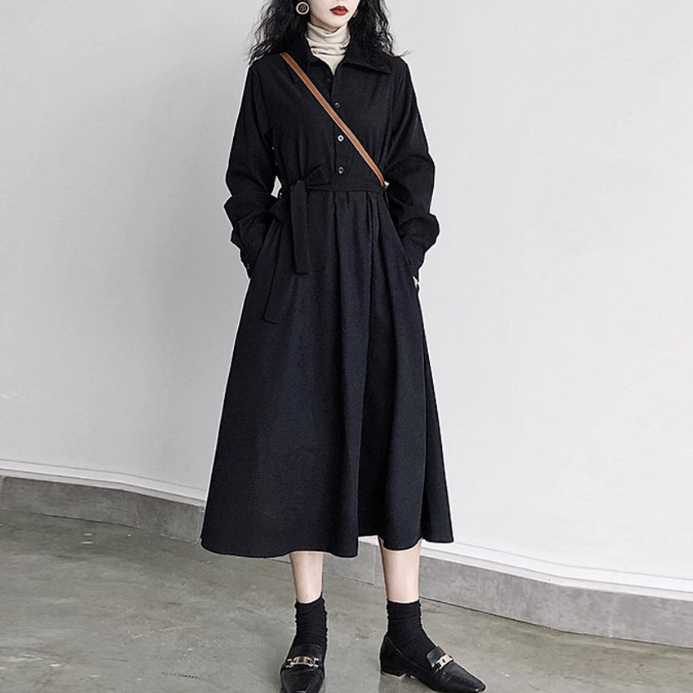 - 新品 黒のシャツワンピース ウエストリボン付き 無地 ブラック 長袖 free314
