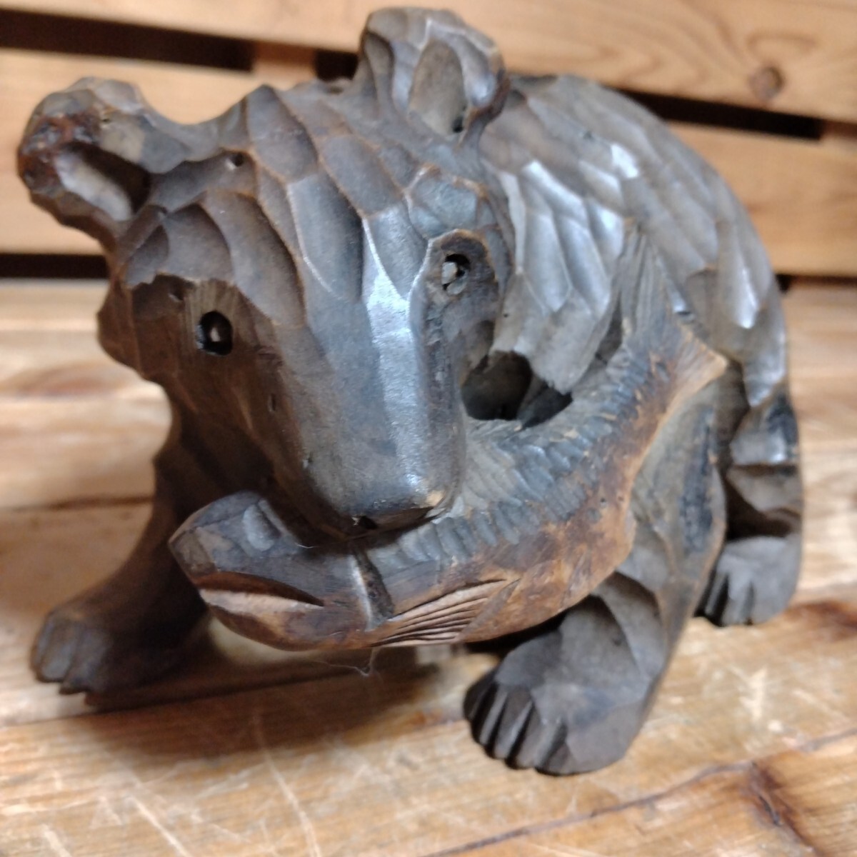 - 昭和レトロ 木彫り 熊 置物 彫刻 工芸品 民芸品 くま クマ 玉眼 骨董