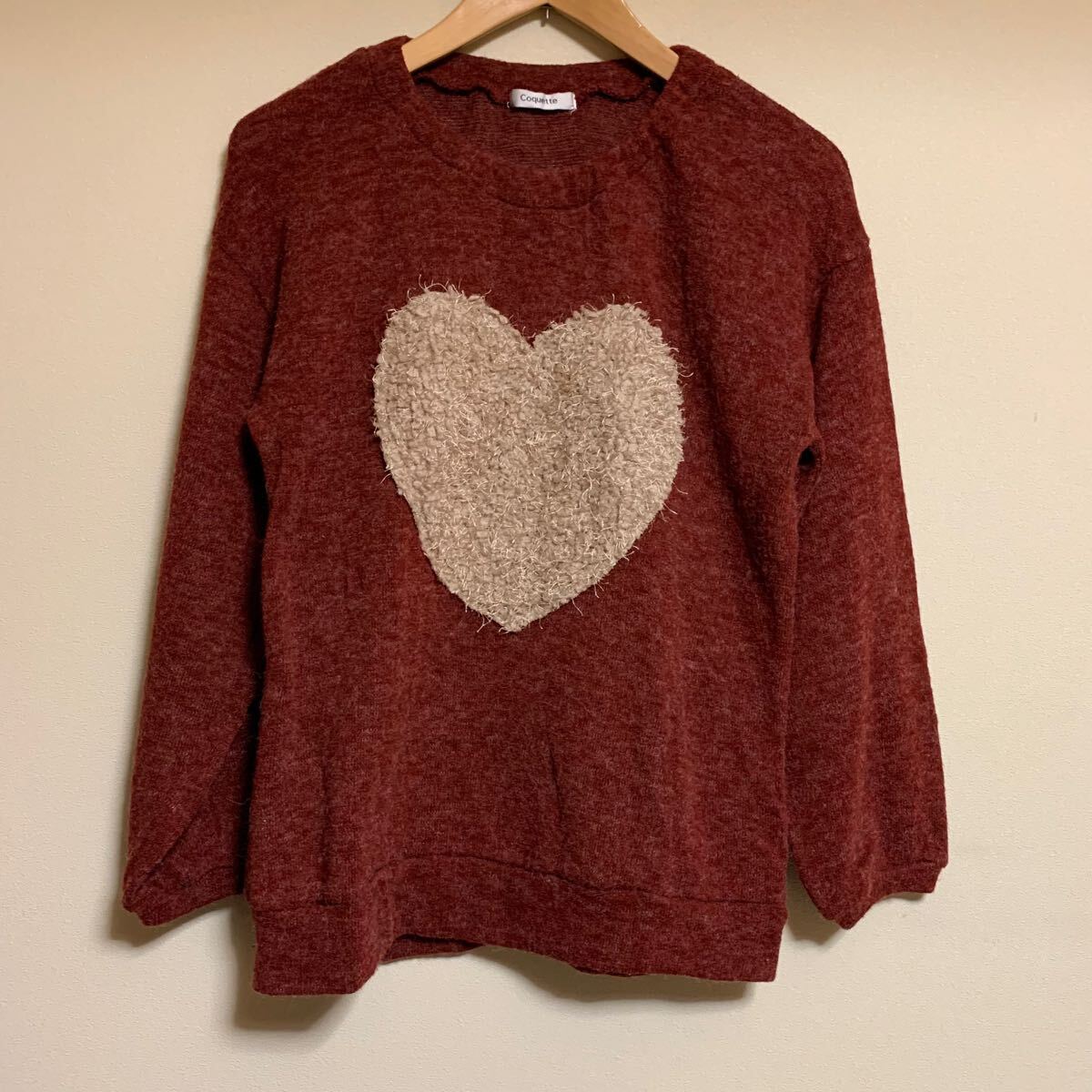 - ニット素材長袖プルオーバー ハートアップリケえんじ色アクリルセーター レッド 赤 クルーネック 長袖トップス 長袖ニット ビッグハート
