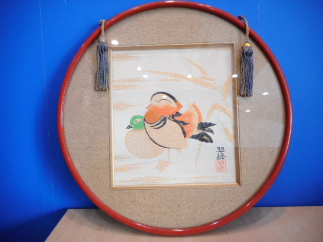 - ◇金糸刺繍刺し子画 『鴛鴦図』 刺繍絵 翠峰 インテリア 丸額入り USED品 箱無し