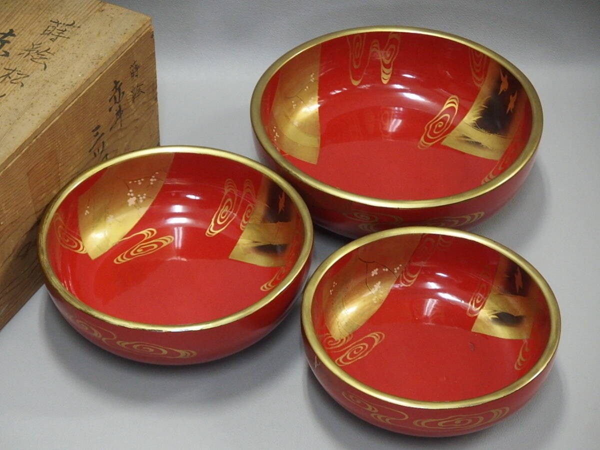 - 【骨董・茶道具】★古い 蒔絵★★松竹梅図三ツ組鉢 gl069vb.7 和食器 菓子器 盛鉢 赤丼