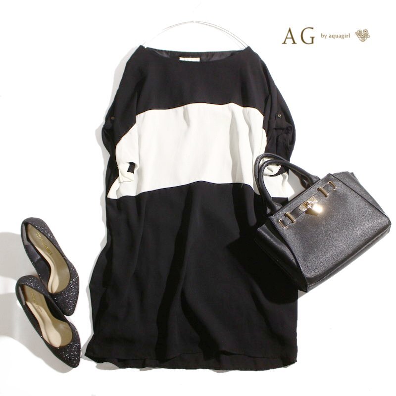 > 美品 AG by aquagirl エージー バイ アクアガール 株) ワールド 夏 2色切替 フォーマル 綺麗め シフォン ワンピース M ブラック 黒 白 半袖