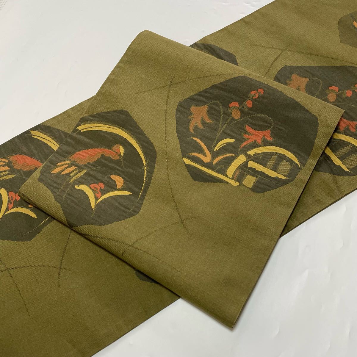 - #H306 美品 袋帯 六通 ふくれ織 鷺 草木 正絹 海松色 和装 和服【wellriver】