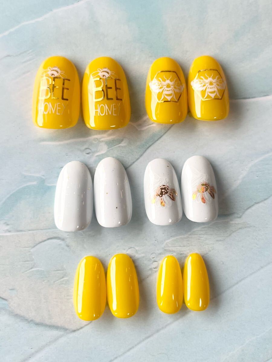 - ハンドメイド ネイルチップ レギュラーオーバル イエロー ホワイト 蜂