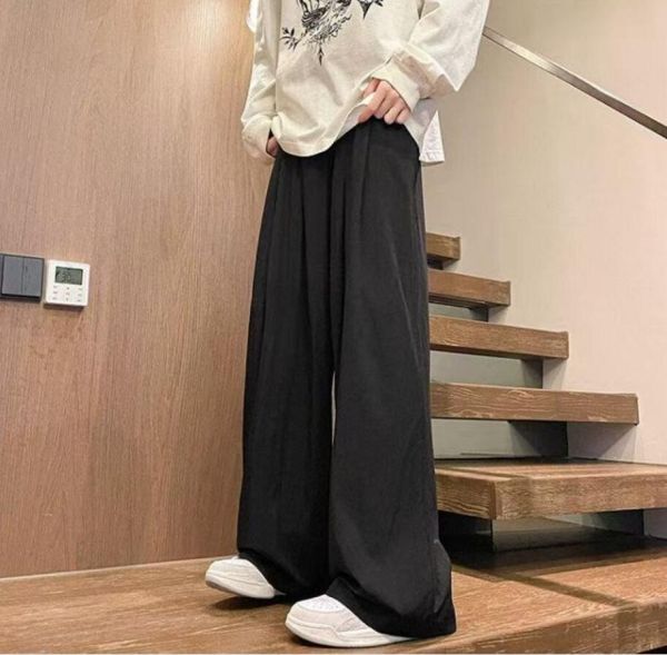 - 春 夏 秋 推薦 /メンズ ワイドパンツ 大きいサイズ ウエストゴム 無地 シンプル しわ加工 長ズボン 薄手 長パンツ / ブラック