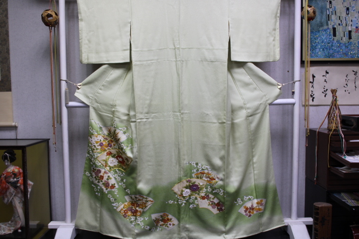 - きもの今昔8613 色留袖訪問着 正絹梨地綸子地 極淡い緑色地の裾ボカシに地紙の四季の花柄 縫紋「剣花角」身丈162cm