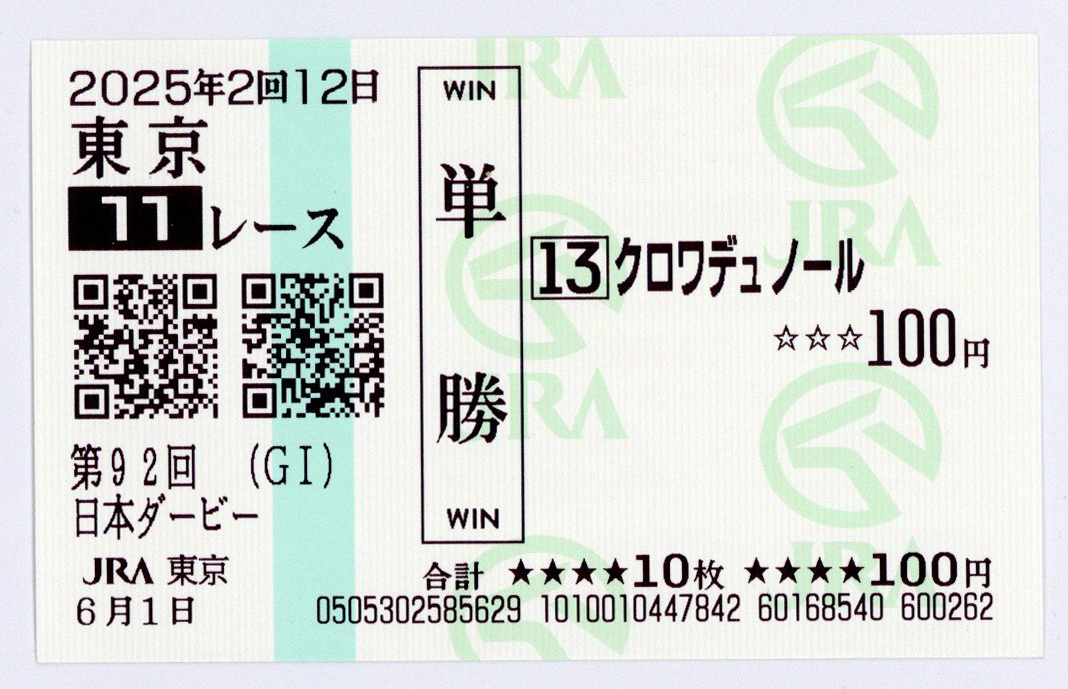 > ★クロワデュノール 第92回 東京優駿 日本ダービー 現地的中 記念 単勝馬券 2025年 北村友一JRA 競馬 極美品 数量9 送料85円 即決