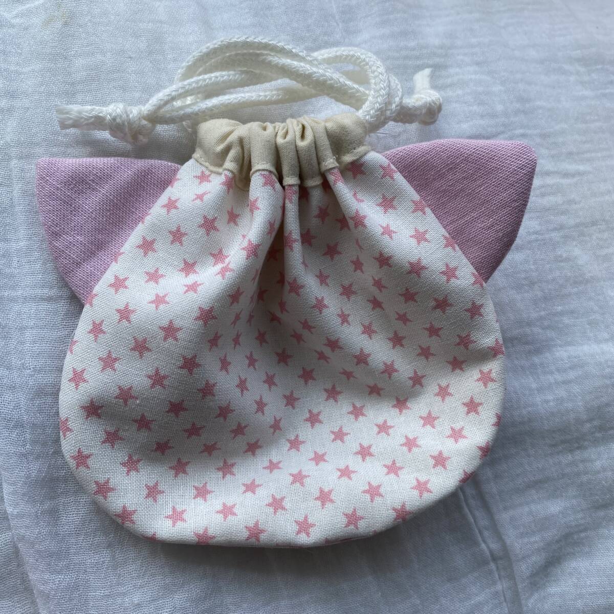 - ハンドメイド 猫耳巾着 ピンク星&ベージュ
