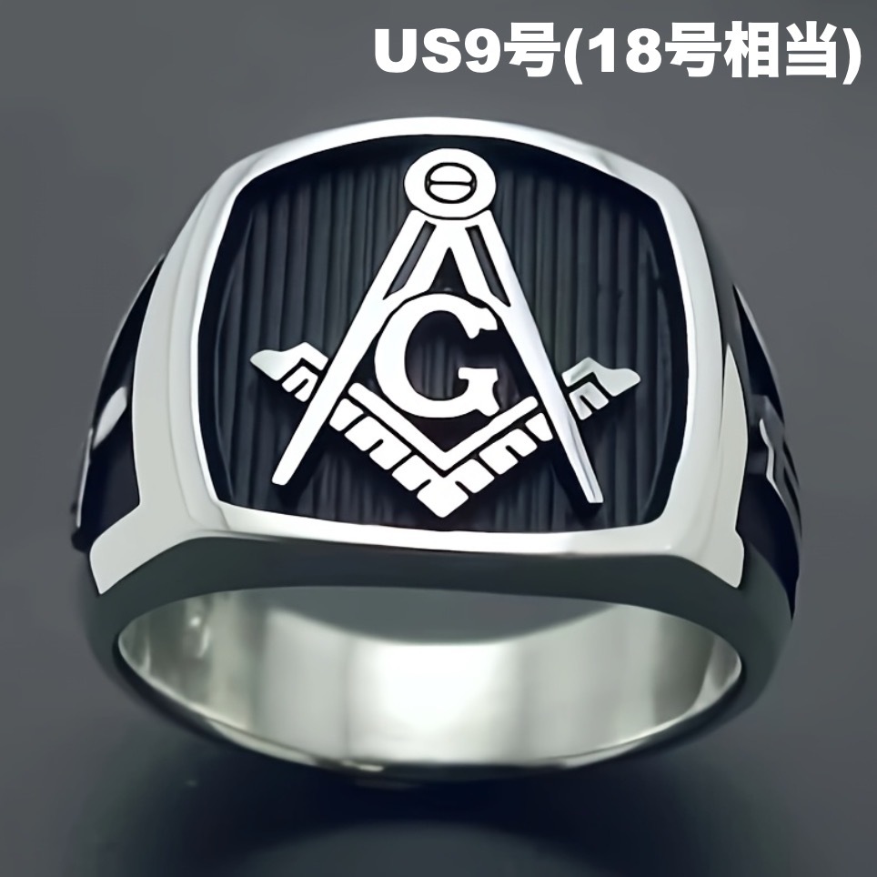 - 指輪 フリーメイソン リング メンズ アクセサリー 重量感 シルバー ブラック 金属 US9号 18号相当 大きい おしゃれ 男性用 目立つ t6990