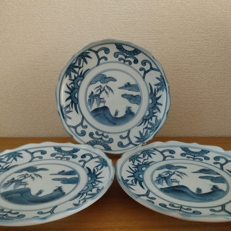 - 有田焼 掛ノ谷窯 山水画 染付皿 3枚セット 手描き