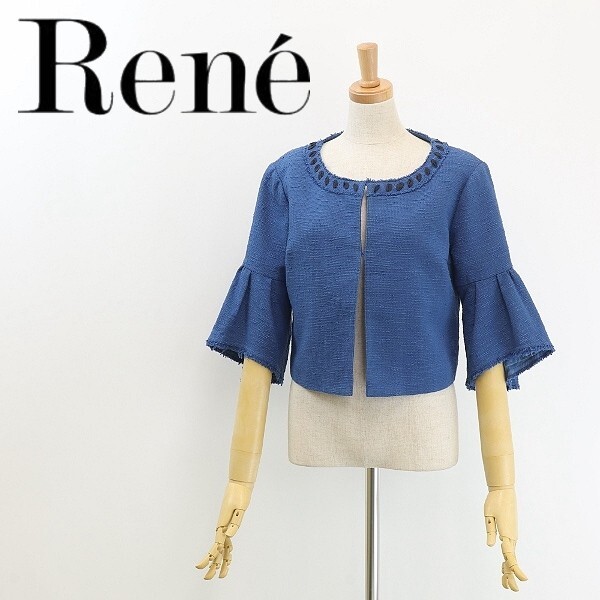 - 美品◆Rene ルネ コットン ツイード フレアスリーブ ノーカラー ジャケット ブルー 34