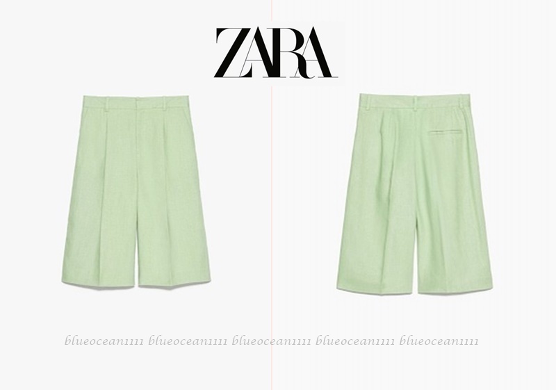 > 新品 リネン100% 膝下丈 【ZARAザラ】綺麗映えカラー ライムグリーン タックハーフパンツ XS(S~相当)麻 スカート Tシャツ ブラウス