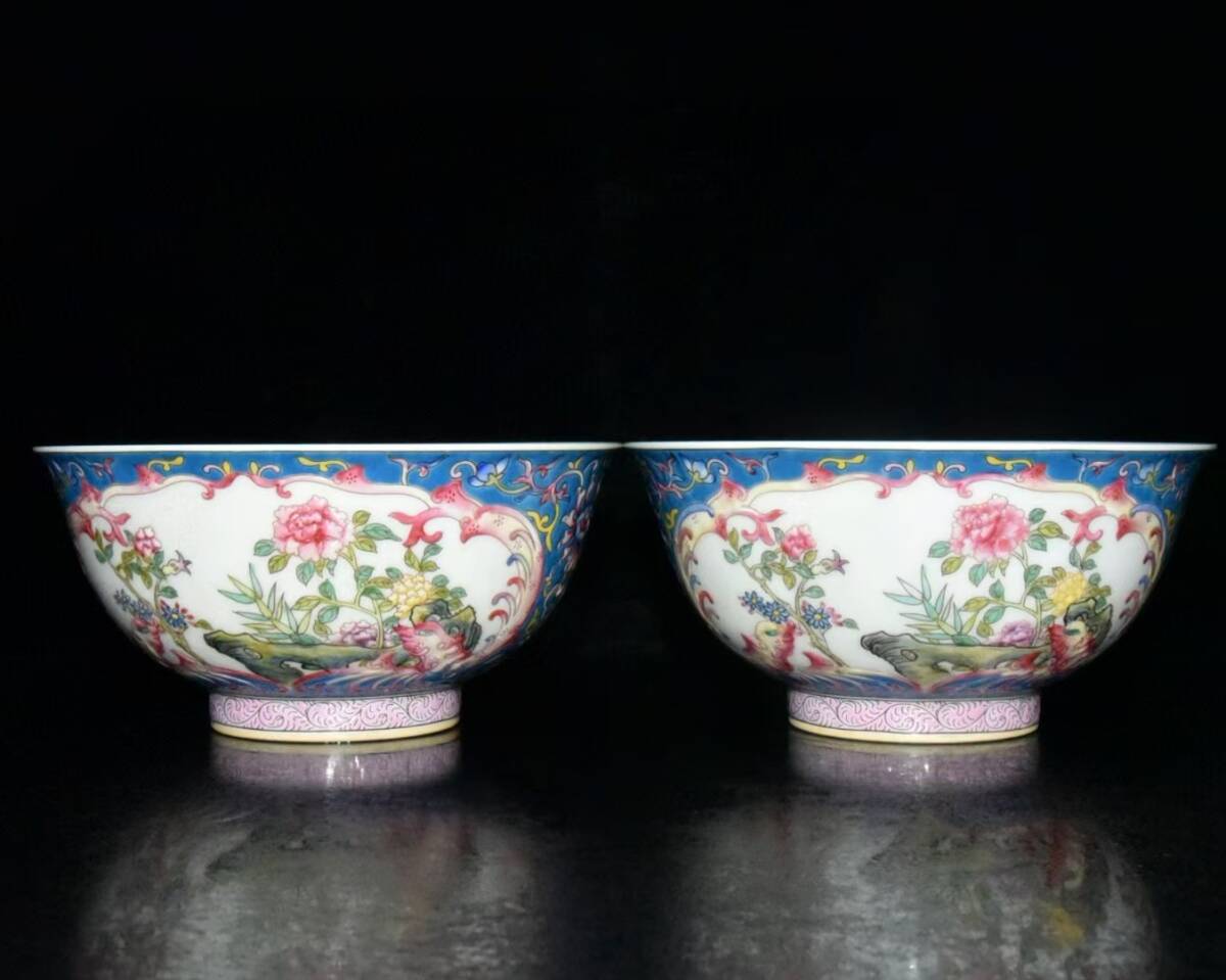 - 磁器 碗 秘藏 清代の官窯 雍正御制 ピンク窓開き花紋碗ペア 酒器 茶器 唐磁 染付 陶磁器 收蔵品 古美味時代物 古美術 古置物 中國文玩6.23