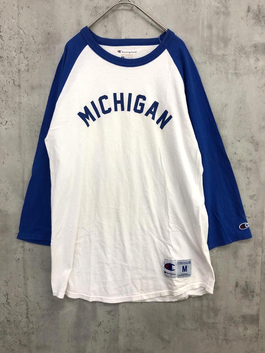 > ゆうパケットOK Champion チャンピオン MICHIGAN ロゴ プリント ラグラン カットソー sizeM/白×青 ■◇ ☆ ffb9 メンズ