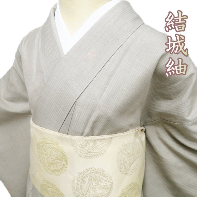 > 特選 結城紬 着物 中古 正絹 袷 カジュアル 縦縞模様 ストライプ 丸模様 白茶色 薄緑色 身丈153cm 裄65cm SA きもの北條 A1219-2