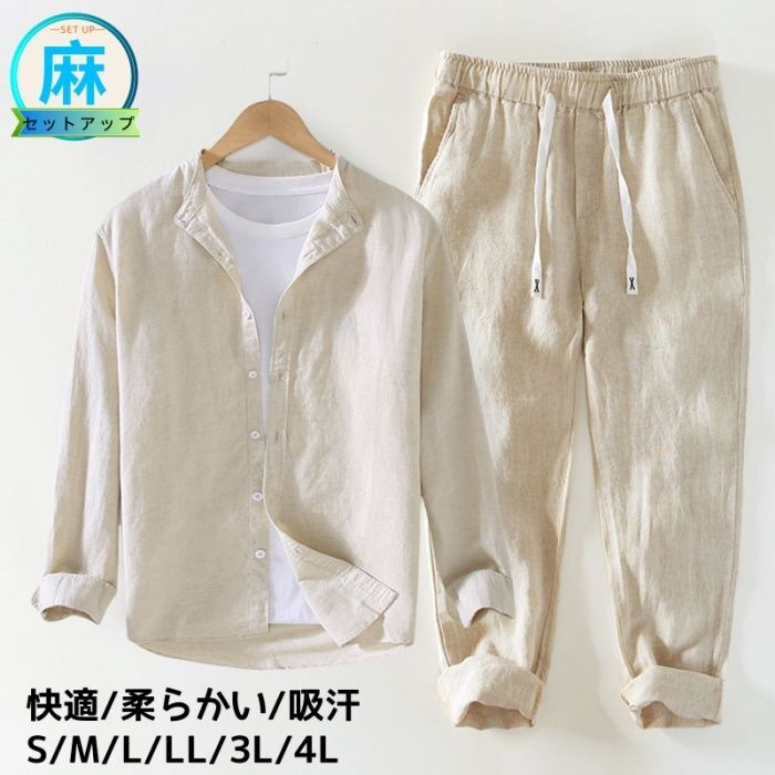 > セットアップ メンズ リネンセット 上下セットアップ リネンシャツ リネンパンツ Zty-5601 亜麻色 トップスのサイズ:L パンツのサイズ:L