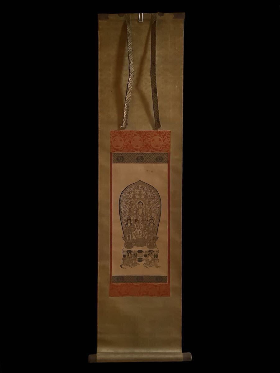 - 掛軸Jun7111[善光寺式一光三尊阿弥陀如来立像]紙本版摺 木版画/仏画 仏教美術 古書