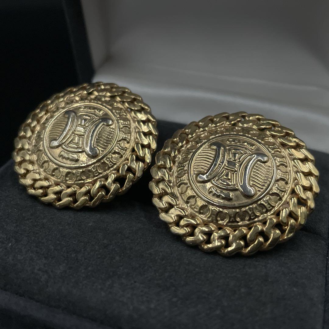 > 希少 オールド CELINE セリーヌ イヤリング ピアス トリオンフ ゴールド 円形 骨型 アクセサリー 両耳