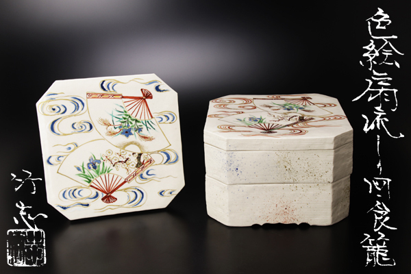 - ★【古美味】川瀬竹志造 色絵扇流しの図食籠 茶道具 保証品 Z3Gz