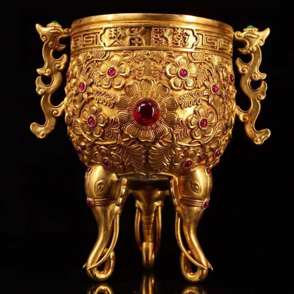- 旧蔵 チベット古寺 清代宮廷御用達金象眼宝石江山永固杯 銅製 銅琉金 唐物 收蔵品 時代物 古美術古置物 希少珍品 供養品 文房具 仏教6.26