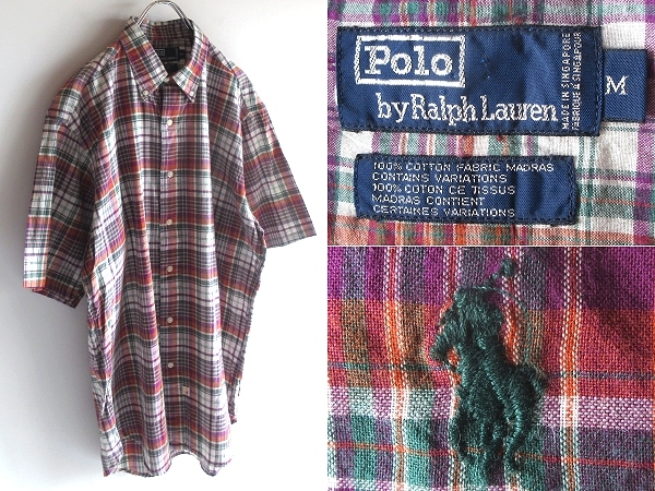 - 希少 90sビンテージ Polo by Ralph Lauren ラルフローレン ポロポニーロゴ刺繍 マドラスチェックシャツ 半袖 BDシャツ M ネコポス対応