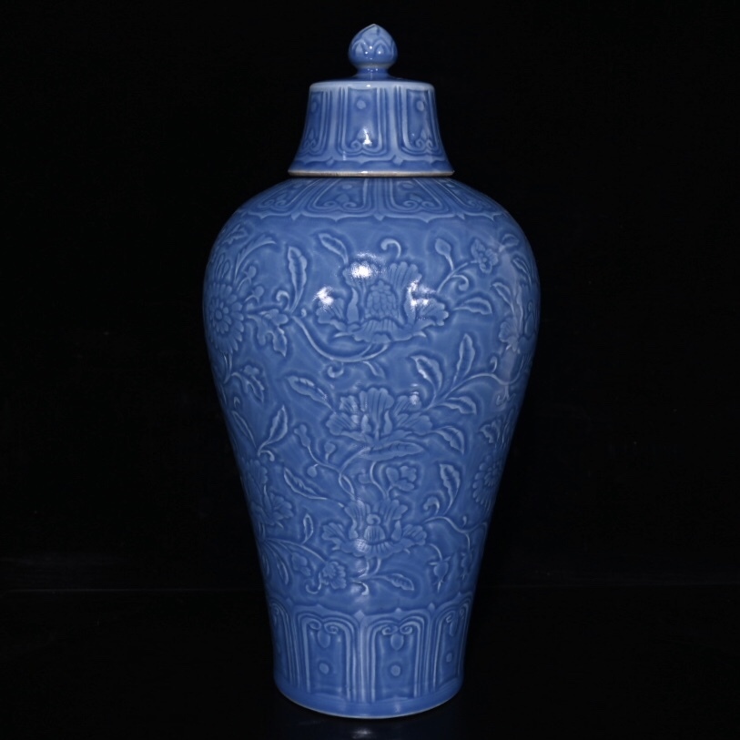 > 磁器 花瓶 秘藏 明代 永楽年制 武英殿天藍釉彫刻牡丹梅瓶 酒器 茶器 唐磁 染付 陶磁器 收蔵品 古美味 時代物 古美術 古置物中國文玩