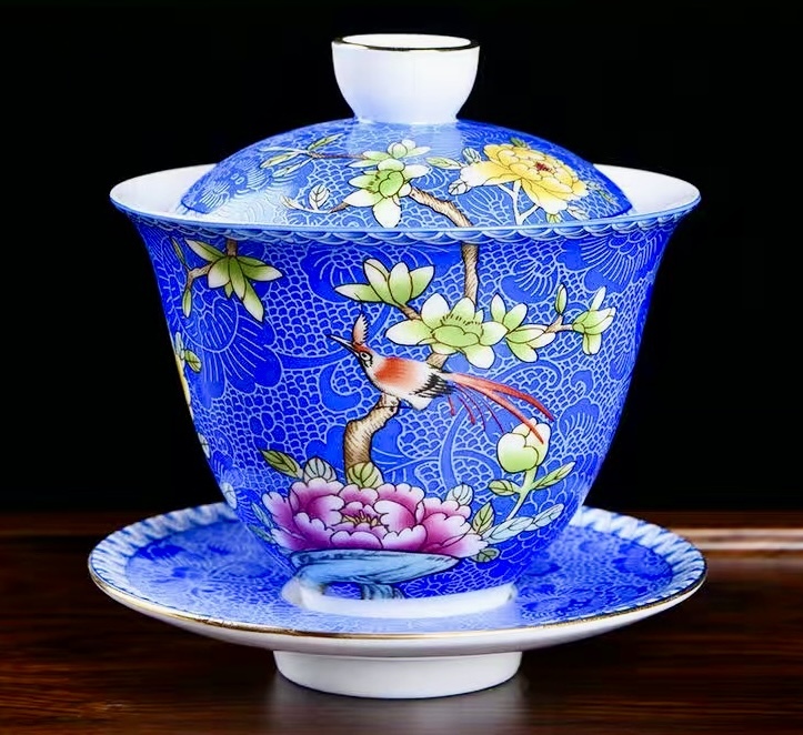 - 蓋碗「鳥語花香」青色(中国茶器)磁器・琺瑯蓋碗