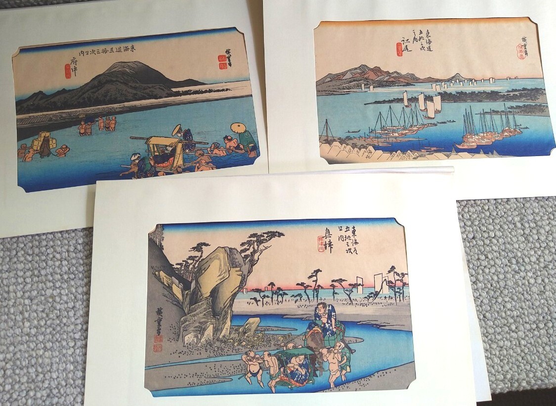 - 【浮世絵3点セット】歌川広重 東海道五十三次 保永堂「興津 興津川」「江尻 三保遠望 」「府中 安倍川 」木版画 高見沢研究所 真作 台紙付