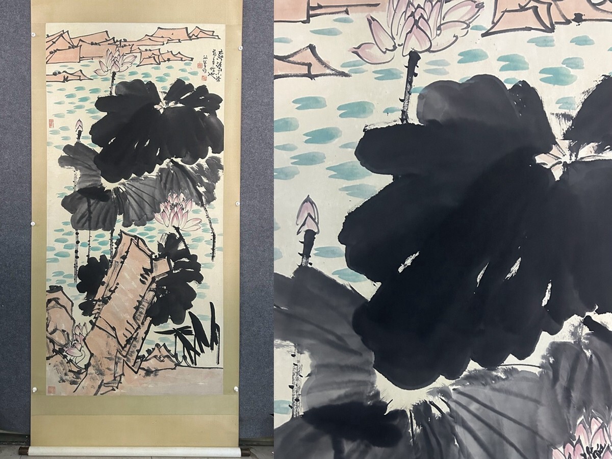 - 中国書画「李苦禅 荷花図」肉筆紙本 掛け軸 墨寶妙品 書画立軸 巻き物 古美術 旧蔵出