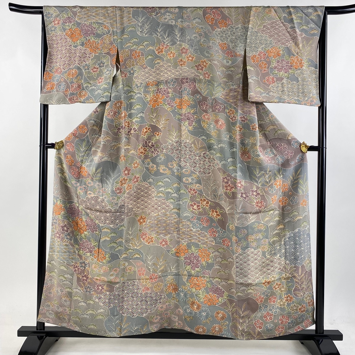> 【在庫一掃】 訪問着 身丈157cm 裄丈65cm M 袷 青山みとも 牡丹 七宝 縮緬 青灰色 正絹 美品 逸品 【中古】