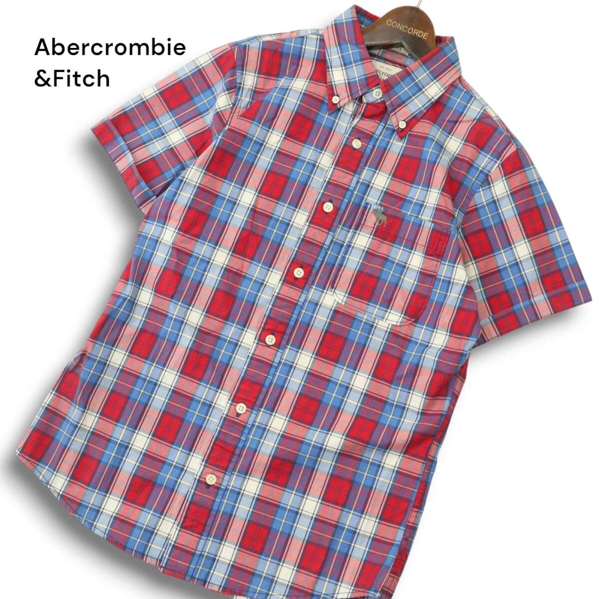 > Abercrombie&Fitch アバクロンビー&フィッチ 春夏 トナカイ刺繍★ 半袖 ボタンダウン チェック シャツ Sz.S メンズ